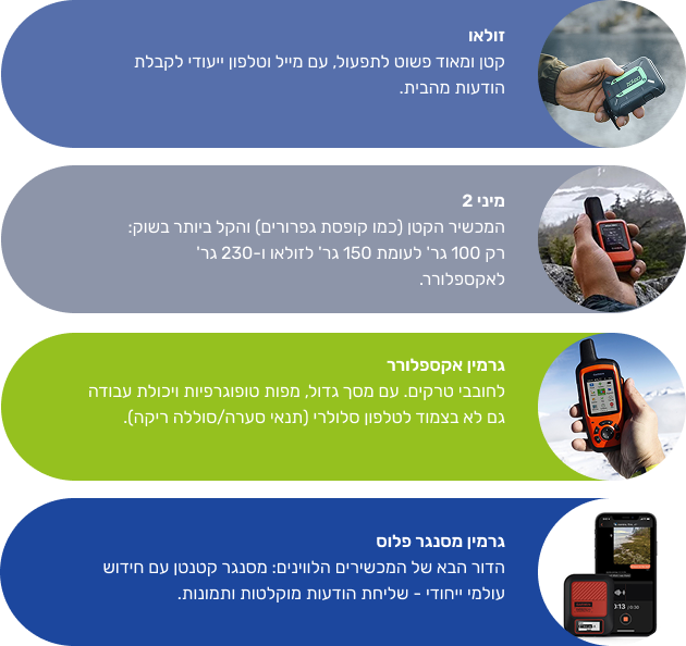 זולאו, גרמין מיני 2, גרמין אקספלורר וגרמין מסנגר פלוס. כולם פועלים ברשת אירידיום - הגדולה בעולם - וכוללים חיבור בלוטות' לסלולרי ואפליקציה ייעודית.